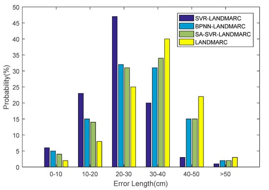 According to different classifications of the algorithm, the mapping error distance distribution map is shown in Figure 7. As can be seen from the figure, the position error results predicted by the SVR-LANDMARC indoor positioning technology are mainly distributed in 20–30 cm with a ratio of 47%; the error results predicted by the BPNN-LANDMARC indoor positioning technology are mainly distributed in 20–40 cm, The proportions of 20–30 cm and 30–40 cm were almost the same, at 32% and 31% respectively; the error length predicted by SA-SVR-LANDMARC is mainly distributed in 30–40 cm with a ratio of 34%. The SVR-based indoor positioning technology proposed in this paper has shown great improvement compared to BPNN-LANDMARC, SA-SVR-LANDMARC and the original LANDMARC. This is because the Gaussian-Kalman method can reduce the influence of some abnormal RSSI signals and make the signals smoother.
