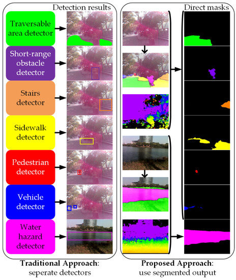 As a matter of fact, each one of these navigational tasks has been well tackled through its respective solutions, and the mobility of the visually impaired has been enhanced. Along with the increasing demand during everyday independent navigation [2,3], the assistance topic highlights challenges in juggling multiple tasks simultaneously and coordinating all of the perception needs efficiently. In response to these observations, the research community has been motivated to offer more independence by integrating different detectors at the basis of traversability perception, which is considered as the backbone of any VI-dedicated navigational assistive tool [26].