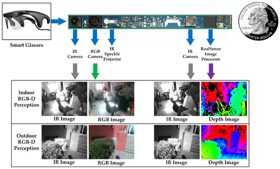 Illustrated in Figure 3, this pair of smart glasses is quite suitable for navigational assistance due to its small size and light weight, as well as the environmental adaptability. Precisely, it is able to perform large-scale RGB-IR-D perception in both indoor and outdoor environments owing to the active stereo design [87]. It leverages a combination of active speckle projecting and passive stereo matching. An IR laser projector projects static non-visible near-IR patterns on the scene, which are then acquired by the left and right IR cameras. The image processor generates a depth map through the embedded stereo matching algorithm. For texture-less indoor environments, the projected patterns enrich textures. As shown in the indoor scenario in Figure 3, the texture-less black shirt hanging on the chair has been projected with plentiful near-IR patterns, which are beneficial for stereo matching to generate dense depth information. In sunny outdoor environments, shown in the outdoor scenarios in Figure 3 (see the shadow of the user on the ground), although projected patterns are submerged by sunlight, the near-IR components of sunlight shine on the scene to form well-textured IR images. With the contribution of abundant textures to robust stereo matching, the combination allows the smart glasses to work under both indoor and outdoor circumstances.