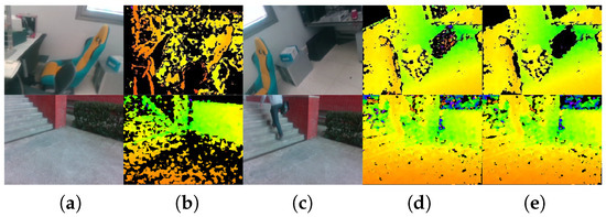 (a,b) Original RGB-D perception, depth images are sparse with many mismatched pixels; (c,d) RGB-D perception with a dense preset configuration; (e) depth images with noise reduction.
