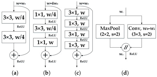 Depiction of the residual layers and the down-sampler block: (a) non-bottleneck, (b) bottleneck, (c) the proposed non-bottleneck-1D and (d) down-sampler block. w: width of the convolution, representing the number of feature maps, s: stride.