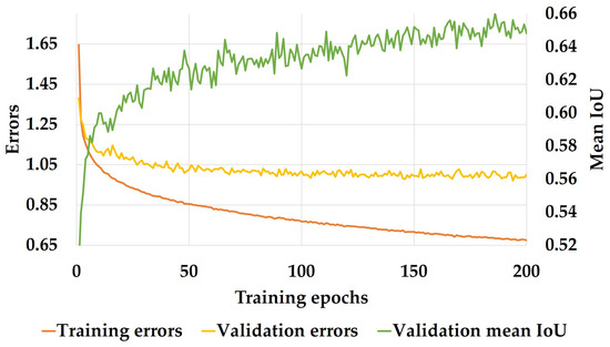 Our model is trained using the Adam optimization of stochastic gradient descent [94]. In this work, training is operated with a batch size of 12, momentum of 0.9 and weight decay of 2 × 10, and we start with an original learning rate of 5 × 10 that decreases exponentially across epochs. Following the scheme customized in [61], the weights are determined as w = 1/ln(c + p), while c is set to 1.001 to enforce the model to learn more information of the less frequent classes in the dataset. For pre-training, we first adapt the encoder’s last layers to produce a single classification output by adding extra pooling layers and a fully-connected layer and finally train the modified encoder on ImageNet [95]. After that, the extra layers are removed, and the decoder is appended to train the full network. In the training phase, we also include Batch-Normalization (BN) [96] to accelerate convergence and dropout [97] as a regularization measure. More precisely, the dropout probability is set to 0.3 in the encoder and 0.1 in the decoder respectively, as this yielded better results in our architecture. With this setup, the training reaches convergence, as shown in Figure 7, when the cross-entropy loss value is used as the training criterion.