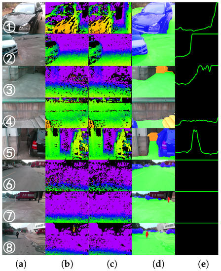 - As shown in Figure 2 and Figure 4d,e, the depth images are de-noised by eliminating small segments. Depth noises can be denoted as outliers in disparity images due to low texture, reflections, noise, etc. [88]. These outliers usually show up as small patches of disparity that is very different from the surrounding disparities. To identify these outliers, the disparity image is segmented by allowing neighboring disparities within one segment to vary by one pixel, considering a four-connected image grid. The disparities of all segments below a certain size are set to invalid. Following [77], we remove small segments with an area smaller than 200 pixels.