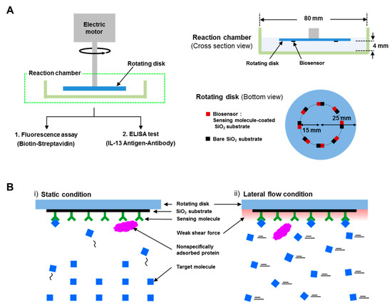 Figure 1A shows the schematic diagram of a high-speed lateral flow biosensing system. The system consisted of a reaction chamber and a rotating disk, which was connected to an electrical motor via a rotating bar. The electrical motor (DAIHAN Scientific Co., Ltd., WiseStir, Seoul, Korea) had a rotating speed range from 0 and 3000 rpm with an accuracy of 1%. The slew rate of the motor was ~100,000 rpm/s, which enabled us to obtain the desired rotating rate (0–300 rpm) instantaneously. The reaction chamber, which contained the target solution, was a commercial petri dish with a diameter of 80 mm. The rotating disk had a dimeter of 25 mm, and biosensors and bare SiO2 substrates were attached on the disk side by side in regions 15 mm from the center of the disk. The distance between the rotating disk and the bottom of the reaction chamber was 4 mm. The system was designed to generate high-speed lateral flow of the target solution on the biosensors and bare SiO2 substrates, when the disk was rotated in the target solution. The lateral flow speed of the target solution was simply calculated by multiplying the angular velocity of the rotating disk by a distance from the center of the disk to the position of the biosensor. As a proof of concept, we used a sensing molecule-coated SiO2 substrate as a biosensor, which was considered to be the sensing part of conventional biosensors. Because conventional biosensors use a sensing molecule-coated surface to capture target molecules, sensing molecule-coated SiO2 substrates were chosen as a simple biosensor in the system. Specifically, we used biotin-coated SiO2 substrates to detect streptavidin proteins and interleukin-13 (IL-13) antibody-coated SiO2 substrates to detect IL-13 antigen proteins. Bare SiO2 substrates were also used to analyze the non-specific bindings of target proteins. In this study, we conducted detection experiments using a fluorescence assay and an enzyme-linked immunosorbent assay (ELISA), which are widely used for biosensing systems due to their high reliability. It should also be noted that since the system can easily generate lateral flows in the target solution just by the arrangement of biosensor positions on a rotating disk, it could be utilized in various biosensing systems.