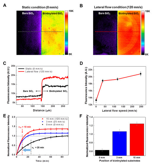 Figure 4D shows the dissociation curves of nonspecifically adsorbed FITC-labeled streptavidin molecules on bare SiO2 substrates under static and lateral flow conditions. For the nonspecific adsorptions of streptavidin molecules on bare SiO2 substrates, bare SiO2 substrates were incubated in 1 µg/mL streptavidin solution for 12 h at 4 °C. The incubated substrates were gently washed with a PBS solution, and the tests were conducted in PBS solution under static and lateral flow conditions for 60 min. The measured fluorescence intensities were fitted using exponential decline functions [24]. Black and red lines indicate the fitting curves of the static and lateral flow condition experiments, respectively. The graph shows that fluorescence intensities decreased significantly under lateral flow conditions, while they barely changed under static conditions. These results clearly indicate that nonspecifically adsorbed streptavidin molecules can be reduced by lateral flows. Considering that the nonspecific binding of molecules reduces the specificity of a biosensing system, the lateral flow strategy could be used to enhance the specificity of a biosensing system.