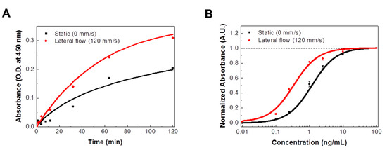 Effects of lateral flow conditions on IL-13 antibody-antigen reactions: (A) Absorbance values of bound IL-13 antigens to IL-13 antibody-coated substrates with or without lateral flows (120 mm/s); (B) Dose-response of IL-13 antibody-coated substrates to IL-13 antigens with or without lateral flows (120 mm/s).