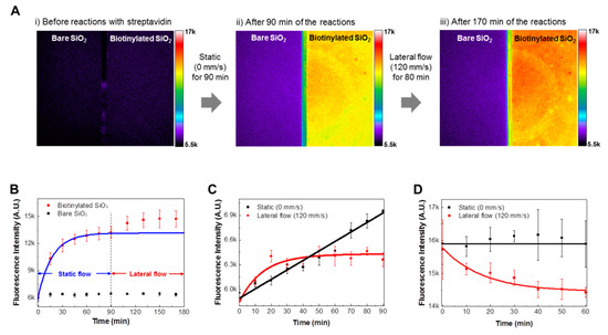 Figure 4A shows the fluorescence images of bare and biotinylated SiO2 substrates (i) before reactions with FITC-labeled streptavidin molecules, (ii) after reaction under static conditions for 90 min, and (iii) after reaction under static and lateral flow conditions for 170 min. The reaction experiments were sequentially performed under a static condition for 90 min, and then under a lateral flow condition for 80 min. Before reactions with FITC-labeled streptavidin molecules (Figure 4(Ai)), only background fluorescence intensities were measured on both the bare and the biotinylated substrates. After reaction under static conditions (Figure 4(Aii)), clear differences in fluorescence intensities between bare and biotinylated substrates were observed. Interestingly, after reaction under lateral flow conditions (Figure 4(Aiii)), the fluorescence intensities of the biotinylated substrate increased, while the fluorescence intensities of the bare SiO2 substrate slightly decreased compared to those of the bare SiO2 substrate in Figure 4(Aii). The results show that the lateral flow increases the specific binding reactions between streptavidin and biotin molecules, while decreasing the nonspecific bindings of streptavidin molecules. These results are consistent with the results of Figure 2C, indicating the reliability of our observations.