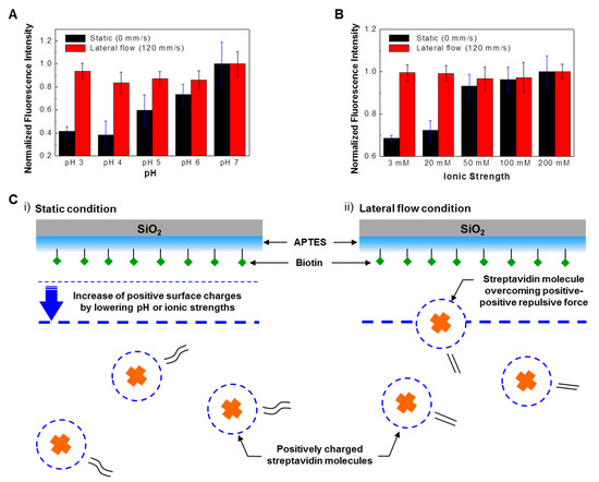 Figure 5C shows schematic diagrams depicting a plausible explanation of the improved binding affinity observed in our experiments under lateral flow conditions. It shows the movement of streptavidin molecules to a biotinylated biosensor under (i) static and (ii) lateral flow conditions in low pH or low ionic strength solutions. Previous work has shown that the decrease in binding affinity between interacting molecules in low pH or low ionic strength solutions can be explained by the net electrical charge of molecules [32,33]. When two interacting molecules with the same electrical charge approach each other, long-range electrostatic repulsive forces between the molecules increase, which obstruct binding interactions between the two molecules. The net electrical charges of streptavidin molecules and biotinylated SiO2 substrates were reported to have positive values below a pH of 6 [32,34,35]. These positive charges increase as pH or ionic strength decreases, enhancing the repulsive forces between the streptavidin molecules and biotinylated surfaces. Therefore, binding reactions between streptavidin and biotin molecules can be attenuated by lowering the pH or ionic strengths of a liquid medium (Figure 5(Ci)).