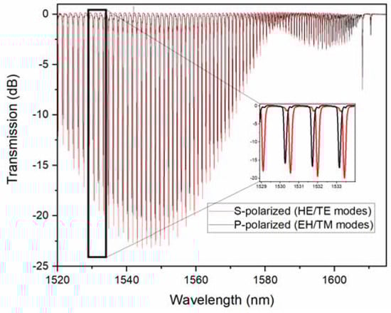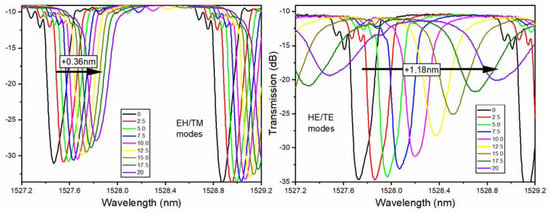 It was clear that HE/TE modes shifted roughly three times faster than the EH/TM modes for average thicknesses, from 0 to 20 nm, and were always towards the longer wavelengths. Such red shifts of the cladding mode wavelengths were expected when the coatings that were added to an OWG had higher refractive indices than the medium that they were replacing (air here). However, the refractive index of copper at these wavelengths was lower than 1 (0.7 actually [34]) and when we simulated the effect of such copper coatings on TFBG resonances, as shown in Figure 5, all of the resonances shifted towards shorter wavelengths, and by a larger amount for EH/TM modes (by −1.2 nm) than for the HE/TE modes (−0.39 nm).