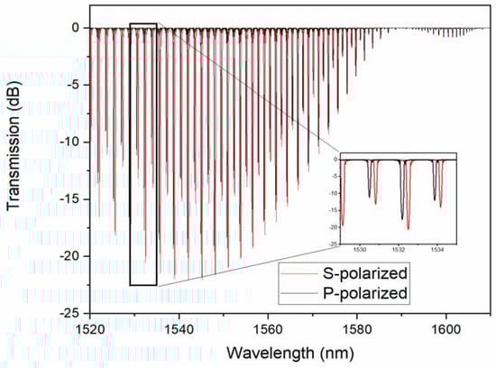 The transmission spectra of a TFBG in air is shown in Figure 1 for input light (core guided) that was polarized parallel to the direction of the tilt (P-polarized) and perpendicular to it (S-polarized).