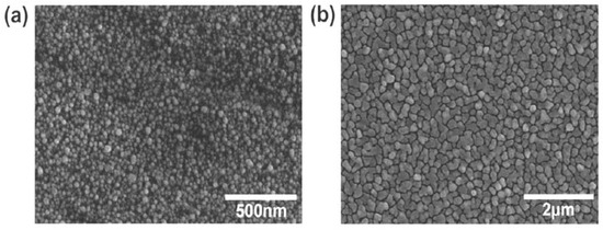 Scanning electron micrographs of copper films on fiber with an average thickness of (a) 5 nm and (b) 40 nm.