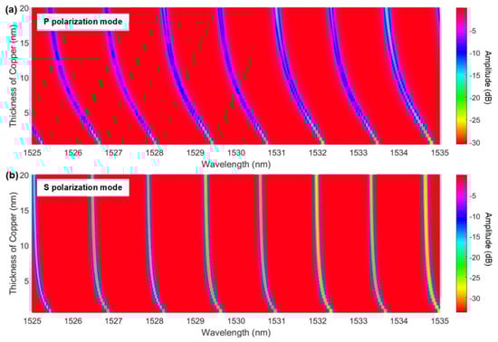 Simulation of the evolution of (a) P-polarized and (b) S-polarized resonances as a function of copper thickness, using the ‘bulk’ permittivity of copper at these wavelengths.