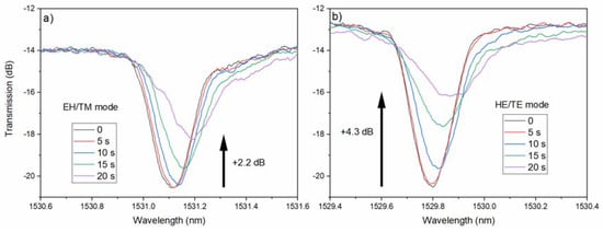 It was not possible to determine exactly the average thickness for each of the times shown in Figure 6, because the deposition proceeded nonlinearly, however it was clear that, similarly to copper, all of the resonances shifted towards longer wavelengths and there were significant differences between the modes, according to their polarization state at the cladding surface, with HE/TE modes showing larger changes than the EH/TM modes.