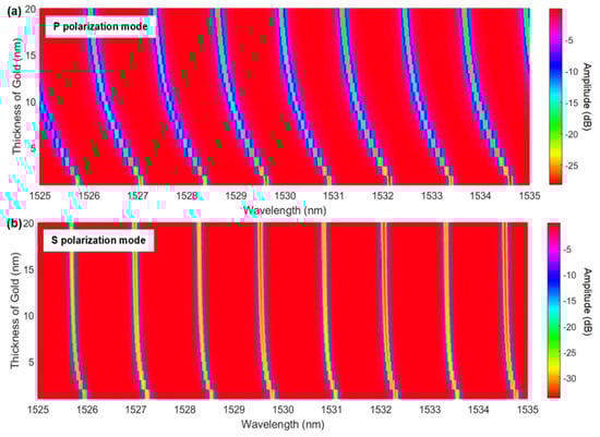 Again, simulations with accepted values for gold refractive indices at these wavelengths were carried out, as shown in Figure 7. Similar to the copper case, gold had a bulk refractive index that was lower than one (i.e., a real part of 0.51 [34]), and the simulated resonance all followed the blue shift with the increasing gold thickness (by −1020 pm for EH/TM modes and −245 pm for HE/TE modes at 20 nm of gold thickness).