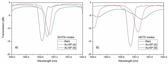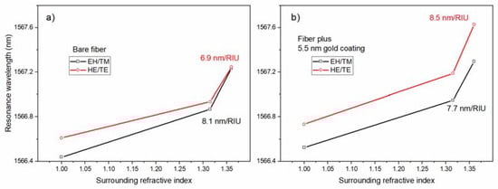 Aside from the impact of the metal/nanoparticle coatings on the optical properties of the TFBG mode resonances, what was actually important was their impact on the sensitivity of these TFBGs when used as chemical sensors. In the first example, an ultrathin gold coating that was obtained by an electron-beam physical deposition system at room temperature, was applied to the surface of a TFBG and was tested for refractometric sensitivity [12]. With an average gold thickness of only 5.5 nm, Figure 10 shows that the response of the HE/TE resonances to the presence of the various surrounding media is significantly different. Normally, the sensitivity of the EH/TM modes to the bulk refractive index changes around the fiber were larger than those for the HE/TE modes, because the former had deeper penetrating evanescent fields, as seen for the bare fiber result, in Figure 10a, where the sensitivity of the HE/TE modes was 15% lower in the important index range between 1.315 (water, at 1550 nm) and 1.36. However, with the addition of a very thin layer of gold nanoparticles, the sensitivity of the HE/TE resonances to the bulk refractive index change became more than 10% larger than for the other polarization (Figure 10b).