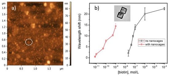 (a) AFM image of the surface of a TFBG coated with a monolayer of 10 nm thick gold nanocages; (b) Wavelength shifts of the most sensitive resonance of TFBGs functionalized with avidin molecules in the presence of biotin at various concentrations (adapted with permission from [9]. Copyright (2014) Elsevier).