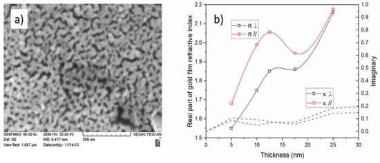 The findings that were described in the previous sections all pointed to the fact that the thin metal coatings had a strong impact on the propagation properties of the modes of the OWGs on which they were deposited, and that this impact depended on the state of the polarization of the modes at the OWG/metal interface. It was further determined that when such metal coatings were used to enhance the performance of the OWG sensors through plasmonic effects, more polarization-dependent features could be found. However, attempts to model the performance of such metal coated OWG structures failed when the widely accepted values of the metal permittivity were used and when the thickness of the metal layer was smaller than a few tens of nm, which often gave the opposite effects to those that were observed experimentally. This was a consequence of the well-known fact that the ultrathin metal layers had properties that were completely different from those of the bulkier samples, and that the differences depended strongly on the fabrication procedures that were used to form the thin layers [30]. In particular, for the layers thinner than a so-called ‘percolation threshold’, the real part of the permittivity of the metals became positive and their conductivity (and associated optical loss) became very small. This was because such layers were inherently discontinuous, because a thin film growth proceeded through nucleation/condensation, which favored a deposition on the existing metal surfaces instead of on the exposed areas of the substrate, which led to voids and trenches. This can be seen on Figure 12a, which shows a scanning electron micrograph (SEM) of the surface of a fiber that has been coated with a 20 nm thick film of gold deposited by evaporation (driven by an electron beam heater).