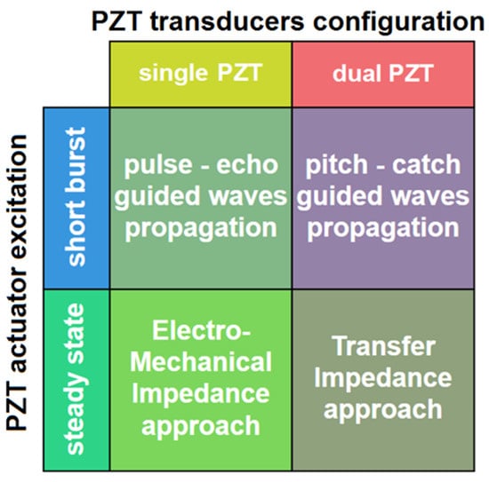 The application of PZT sensors to SHM is always based on the propagation of elastic waves, usually Lamb waves, through a monitored structure [,,,]. However, four different setups of PZT transducers can be distinguished in applications. There are two factors allowing for distinction between the setups [,,,]: