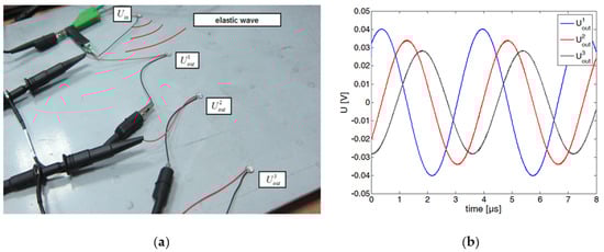 As mentioned in the introduction, one of the methods for PZT transducer application to damage detection is to apply a sinusoidal steady state voltage to a PZT actuator and measure the voltage on a PZT sensor, which is induced by elastic waves propagating between the PZT actuator—PZT sensor pair. In Figure 2, an example of voltage signals , are presented, which were obtained for three different PZT sensors receiving elastic waves excited by an actuator sourced with sinusoidal voltage . If a sinusoidal voltage— is applied to PZT actuator, then the induced voltage on the sensor— is also sinusoidal and has the same frequency as . Thus the ratio:
