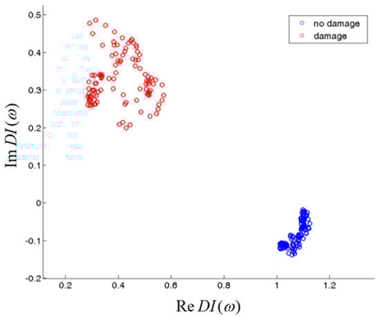 In the presented example all of the frequencies were influenced by a damage, therefore a single frequency could be used for structure assessment in this case. However, it is not necessary to limit the data and to use DI value obtained at a given frequency for the purpose of damage detection. Rather DIs’ behavior obtained for a range of frequencies should be used as it is better suited for damage detection and classification. It is possible that damage of a certain type would affect the DIs only in a limited frequency range. In such case two groups of data would be formed in the complex plane: the DIs obtained for frequencies not sensitive to damage would be close to the point 1 + i0, whereas DIs influenced by damage would be separated from it. In this way optimal range of frequencies for the purpose of damage detection could be established.