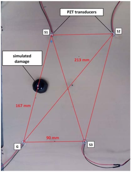 Four PZT transducers of the same type were deployed on the surface of the specimen, precisely above four selected PZT transducers embedded in the specimen structure. The orientation of the attached transducers was maintained the same as for the embedded transducers. In Figure 5 the geometry of the PZT networks is presented. For each network, one of PZT transducers was selected as PZT actuator whereas the remaining three transducers were used as PZT sensors. The positions of the actuator G, and the sensors S1, S2, S3 are indicated in Figure 5. For each network three sensing paths were used (Figure 5):