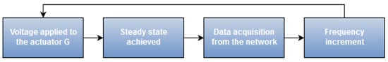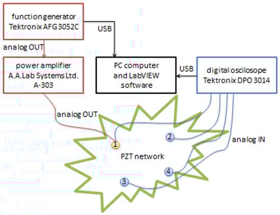 The function generator was used to provide a sinusoidal signal with constant predefined amplitude in a given frequency range. The power amplifier was used for signal conditioning both for the voltage (20×) and for the current (up to 200 mA) in order to operate PZT actuator in the frequency regime where impedance of the actuator is low, i.e., close to the resonant frequency of piezo elements used [,]. The digital oscilloscope was used for measuring the excitation voltage on the PZT actuator—G—as well as induced voltage on the three sensors: S1, S2, S3. The devices were connected to a PC computer with an installed LabVIEW environment.