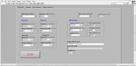 An application in the LabVIEW environment was developed, which allowed automatization of the measurement process, configuration and synchronization of the devices, as well as visualization and storage of the acquired data. In Figure 8, the setup panel of the application is presented.
