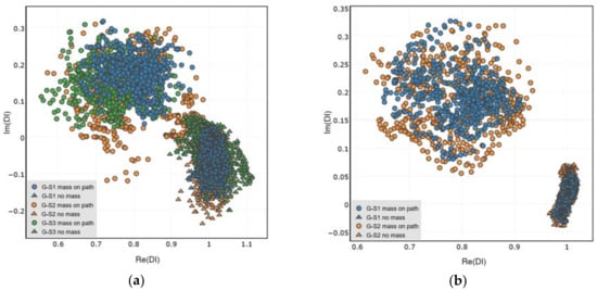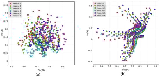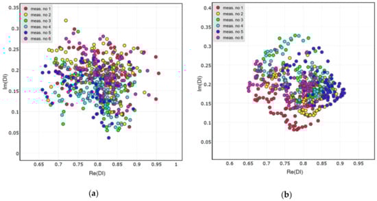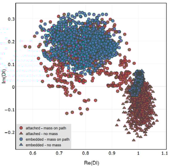 Remarkably, DIs obtained for different sensing paths under simulated damage condition are located in similar domains of the complex plane. This can be observed both for the attached and the embedded sensors. The material used for the experiment is anisotropic, so the PZT sensors also exhibit some anisotropies when interacting with elastic waves []. However, there is no significant dependence of the results (Figure 15) on the direction of sensing path or orientation between the actuator and the receiver (Figure 5). Also, the length of sensing path does not influence the DIs’ distribution. This property is of particular importance for damage classification possibility based on the proposed DIs. Since the DIs are located at the same region of the complex plane for comparable measurement conditions, it is possible to apply statistical methods for damage classification, e.g., nearest neighbor algorithm, for damage classification [].