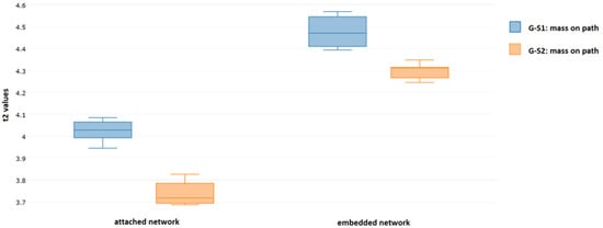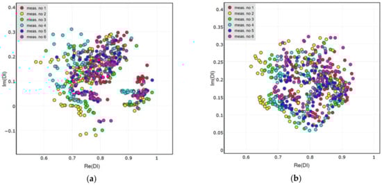 The separation of data can be quantified by using Hotelling’s T-squared distribution (T2) []. It is used for statistical testing of difference between means of multivariate random samples. Higher values of T2 distribution obtained for two groups of multivariate data indicates more significant separation of the two groups. In Figure 17 boxplots of values of T2 distribution obtained for DIs calculated for repetition of measurements are presented. The values of T2 were obtained as: