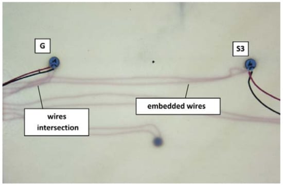 Distributions of DIs obtained for the presence of simulated damage are presented in Figure 11, Figure 12 and Figure 13 below. Both the attached and the embedded PZT networks are considered. DIs obtained for repeated measurement condition, i.e., presence of simulated damage, are concentrated around a similar point in the complex plane, therefore repeatability of the proposed method was confirmed. As expected, both the amplitude and the phase of voltage induced on PZT sensors are affected by simulated damage. Also, similar pattern of DIs distribution can be observed for different sensing paths, except for the embedded sensing path G-S3 (Figure 13b). In this case the spread of data is significantly higher compared to other cases. This can be caused by improper configuration of the embedded wires connected to G and S3 embedded transducers (Figure 14). The wires connected to actuator G, to which high voltage was applied, runs in parallel to wires connected to the sensor S3, used for low voltage measurement. This could have impact on the voltage induced on the sensor S3 and interfere with the results, resulting in increased spread of data in that case.