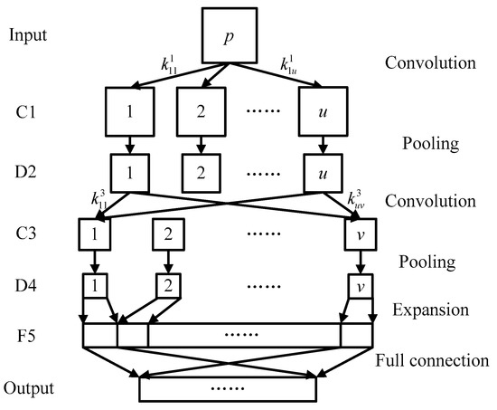 The convolution layers and down sampling layers are alternately arranged. Different network structures can be obtained by setting different numbers of layers and parameters. The elements of all the output feature matrices of the upper layer are expanded in sequence at the end of the neural network. These elements are used to form a feature vector that fully connects to the output layer to obtain the output of the entire network.
