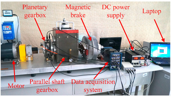 The experimental analysis flowchart of the proposed method for fault feature extraction and diagnosis of planetary gears is displayed in Figure 5. The time-domain waveforms of the vibration signals for normal gear, gear with wear, gear with root crack tooth, and gear with breakage from uniaxial sensor 1 are displayed in Figure 6. The basic parameters of the two-stage planetary gears of the DDS mechanical fault comprehensive simulation bench are presented in Table 1.