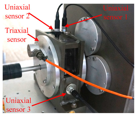 The original vibration signals of the planetary gears were collected on a DDS mechanical fault comprehensive simulation bench made by Spectra Quest Company from the United States. The simulation bench displayed in Figure 2 is primarily composed of a variable-speed motor, a two-stage planetary gearbox, a two-stage parallel shaft gearbox, a magnetic brake, and other devices and sensors. The motor output frequency was 40 Hz and the magnetic brake load was adjusted to 13.5 N·m using PC-control software matched with the simulation bench. As the frequent mesh of the sun gear occurs during planetary gear transmission, faults tend to occur here. In this study, the sun gear faults of second-stage planetary gear were chosen to be studied, and the vibration signals were collected from normal gear, gear with wear, gear with root crack tooth, and gear with breakage. The arrangement of test points and vibration acceleration sensors is displayed in Figure 3 and the measured gears are displayed in Figure 4. A triaxial sensor and several uniaxial sensors were used to collect vibration signals. The sampling frequency of vibration acceleration sensors was 13 kHz. According to the effect of signal collection, the signal of uniaxial sensor 1, close to the second stage planetary gear, was selected for analysis.