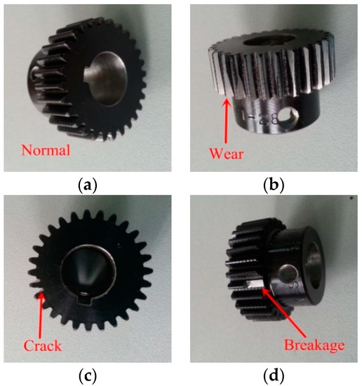 Second-stage sun gears in four states: (a) normal gear, (b) gear with wear, (c) gear with breakage, and (d) gear with root crack tooth.