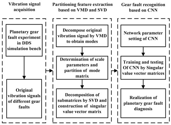 The mathematical model for this novel fault feature extraction and diagnosis method of planetary gears was established, which includes two parts. In the first part, signal modes were obtained using VMD to decompose the original vibration signal. Then, a method of extracting local fault feature information and composing global feature was adopted. Data compression and feature extraction were completed by dividing the mode matrix into submatrices using SVD. In the second part, CNN was used to perform feature identification. Finally, accurate fault classification and diagnosis was achieved.
