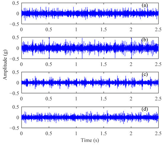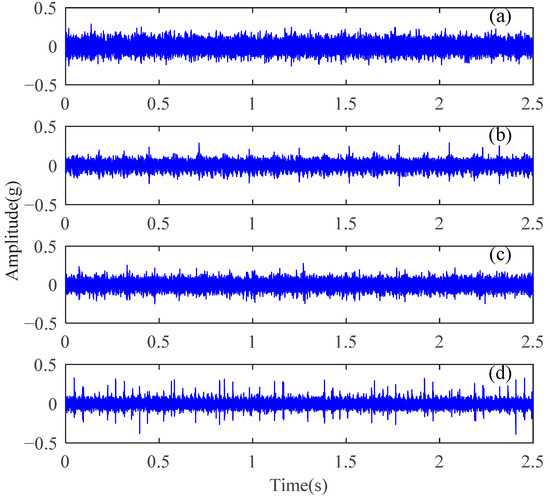 Time-domain vibration signals of the planetary gears: (a) normal gear, (b) gear with wear, (c) gear with breakage, and (d) gear with root crack tooth.