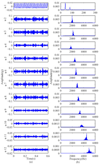 The gear fault feature information can be extracted using the proposed method of partition fault feature extraction based on VMD and SVD. The vibration signals of the second stage sun gear fault are decomposed by VMD. The number of signal sampling points was 7808, and the corresponding time length was 0.6 s. According to the test specific conditions, while avoiding excessive decomposition, set the modes number K = 12, quadratic penalty term α = 2000, and time constant τ = 0. To verify the effectiveness of the proposed method, an ensemble empirical mode decomposition (EEMD) was used to compare with its results with VMD. For EEMD, the amplitude of the added white noise was set to 0.2 times the standard deviation of the original vibration signals and the number of added white noise was set to 100. As an example, the vibration signal of gears with breakage was decomposed to 12 modes using VMD, whereas 12 IMFs and a residual component are obtained using EEMD. Because of the limited space, the first to sixth modes, IMF5 to IMF10, and their spectrums are displayed in Figure 7 and Figure 8, respectively.