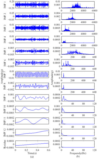 EEMD results of gear with breakage: (a) IMFs; (b) frequency spectrums.
