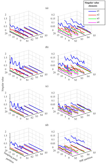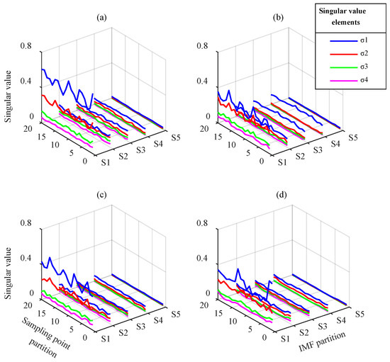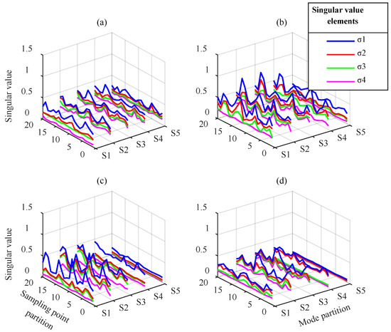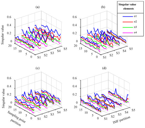 Singular value vector matrices from VMD: (a) normal gear, (b) gear with wear, (c) gear with breakage, and (d) gear with root crack tooth.