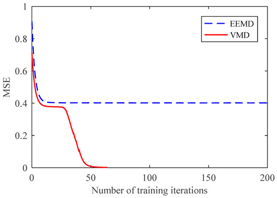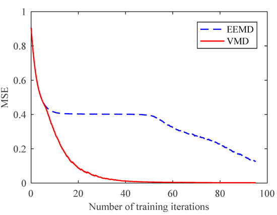 However, further comparative analysis showed the speed advantage of the VMD-based partition extraction method. As shown in Figure 11, the mean square error (MSE) curves of CNN decreased with training time. The MSE of the CNN trained with VMD samples had a much faster decreasing speed, which means a better training effect. In fact, samples from VMD only required 14 iterations to obtain a 100% total recognition rate. This effect has never been achieved by samples from EEMD with training 100 times. The slow training speed of the CNN proves that the EEMD-based partition method is insufficient for fault feature extraction and state classification. In contrast, the advantages of the VMD-based partition method in feature extraction, training speed, and recognition rate are reflected. Based on the above results, the proposed method was proven to effectively extract fault feature information and accurately diagnose planetary gear faults.