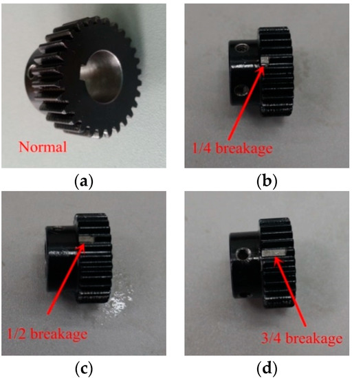 Four breakage degradation states: (a) normal gear, (b) one-quarter breakage, (c) one-half breakage, and (d) three-quarters breakage.