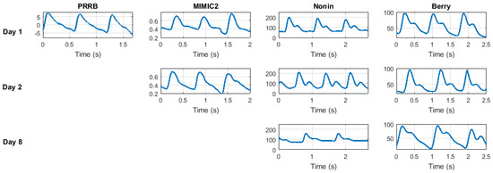 Figure 2. Representative photoplethysmogram (PPG) signals extracted from several databases. For each database, segments belong to the same subject in a different session (days 1, 2, and 8 when available).
