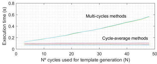 Feature extraction methods that use multi-cycle templates obtain better performance than methods using cycle-average templates, especially in the long-term results (see Table 3). Analyzing the average methods group, use of the time domain (cycles average) or the transform domain (KLT average) to calculate the EER value did not significantly affect the results. The type of distance used (Manhattan or Euclidean) also did not significantly affect the results. The same can be said for the multi-cycle methods group, as shown in Table 3. Regarding the N value in the EER results (see Table 3), an improvement in mean values can be observed in most cases when the number of cycles used for the enrollment and testing templates increases. As Figure 3 shows, the execution time of multi-cycle methods increases quadratically with the number of cycles in the templates (N). However, this time is not significant in comparison with the acquisition time, which really determines the time required to authenticate a user because in an operative real scenario, all PPG cycles (N) would be recorded before proceeding in the authentication process.
