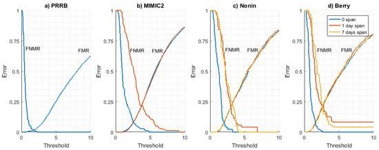 FMR and FNMR curves obtained for all datasets are shown in Figure 4. The long-term stability of these curves has been analyzed using the Nonin (Figure 4c) and Berry (Figure 4d) datasets as they are the only ones available with signals from at least three different days. It can be seen that FMR is very stable for each time interval value (0, 1, and 7 days), indicating that the difference between a user PPG model and the rest of PPG models for other users is time-invariant. On the other hand, FNMR curves show a converging behaviour as the time interval increases, stabilizing for a 1-day time interval value (values for 1 day and 7 days are close).