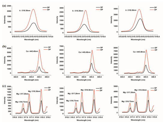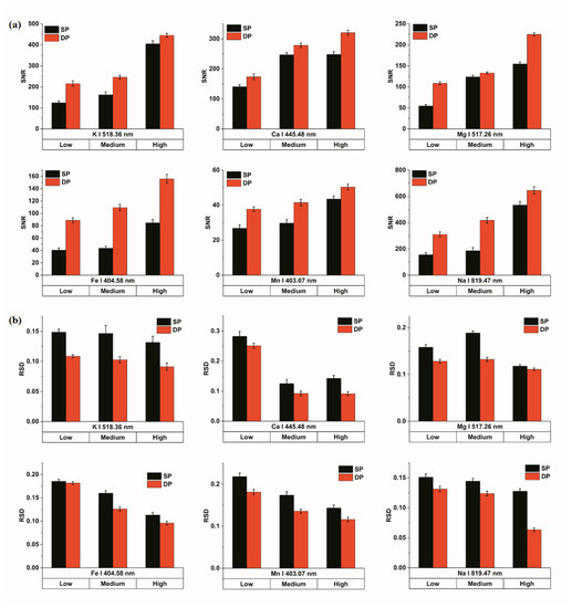 - Nicolodelli, G.; Senesi, G.S.; Romano, R.A.; de Oliveira Perazzoli, I.L.; Milori, D.M.B.P. Signal enhancement in collinear double-pulse laser-induced breakdown spectroscopy applied to different soils. Spectrochim. Acta Part B Atomic Spectrosc. 2015, 111, 23–29. [Google Scholar] [CrossRef]