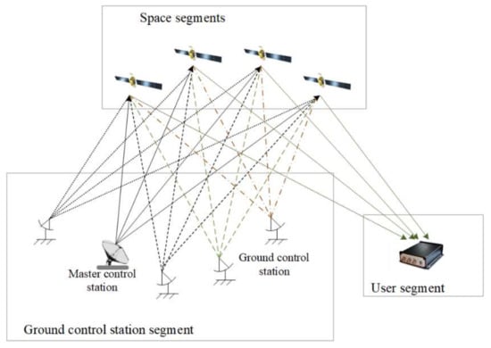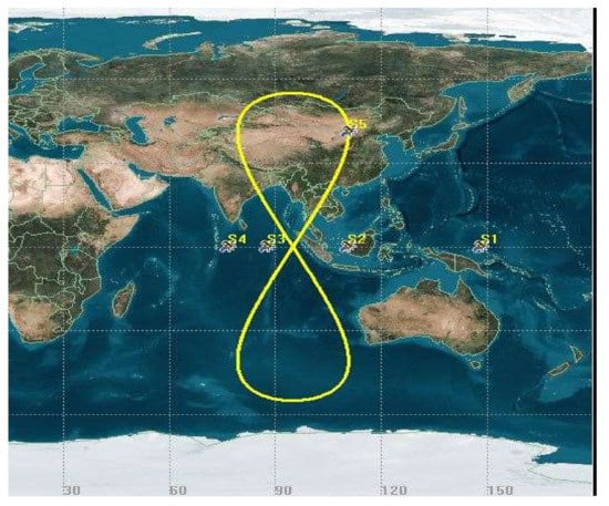 The basic structure of CAPS, consisting of the space, ground control station and user segments, is shown in Figure 1 []. The space segment includes GEO and IGSO communication satellites that receive and forward the navigation signal generated at the ground control station. There were four GEO satellites and one IGSO satellite available at the time of our experiment (see Figure 2). The ground control station segment is mainly responsible for terrestrial satellite monitoring and control, high-precision satellite orbit determination, navigation signal generation and transmission, time-frequency reference and communication. One of the ground control station is selected as the master control station. The user segment indicates all kinds of rover receivers, and it can track the navigation signal, communicate with the satellite, produce the raw measurement and achieve the positioning and timing.