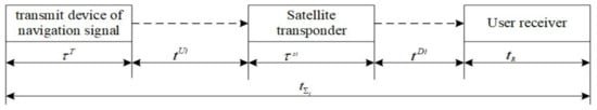 Based on the CAPS navigation signal from each individual CAPS satellite tracked by the receiver, the user can obtain the propagation time from the master control station to the user through each satellite. The satellite orbit, virtual clock model, and atmospheric model can be decoded from the received ephemeris message. The total propagation time of the navigation signal from the master control station to the satellite and then to the user can be divided into five parts shown by Figure 3 and Equation (1) with a time unit.