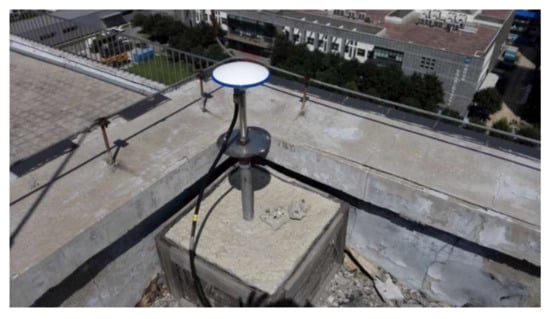 The noise of the code and carrier-phase measurement can generally be assessed using the data from the static zero-baseline experiment with a common antenna [,]. The residual of the double-differenced observations on the inter-station and inter-satellite, in which the errors of the orbit, the bias resulting from the virtual clock offset model, ionospheric error, tropospheric error, receiver hardware delay and clock offset have been eliminated, is able to indicate the noise of the raw un-differenced code and carrier-phase measurement. We carried out the zero-baseline experiment tracking the CAPS navigation signal for more than four hours on 1 August 2017, with a 4-Hz sampling frequency, and the number of total epochs was over 70,000. Since CAPS are still in the development and testing phase, there is no commercial CAPS receiver yet. Two receivers developed by ourselves from scratch were used in this zero-baseline experiment. The basic structure of the self-developed receivers is almost like a GPS receiver. The largest difference is that the frequency of the coming signal is the C-band which means the carrier replicated by the CAPS receiver while acquisition and tracking is the C-band. There is no anti-multipath processing inside the current receiver. Those two receivers are connected to the same antenna via a power splitter. The antenna in our experiment was installed on the roof of the Academy of Opto-Electronics (AOE) in Beijing, China, and the CAPS navigation signals from the 4 GEO satellites and 1 IGSO satellite were tracked by our receivers during the experiment period. Since the observation environment is very open (see Figure 5), the multipath error can be considered at a relatively low level. For a receiver located in Beijing, the 4 GEO satellites are always visible while the IGSO satellite is visible for about 10 h every day. During the experiment, the visible time in Beijing is about 6:00 to 16:00 local time, and it cannot be seen during the rest of the time, which makes the three-dimensional solution impossible. The data in the experiments was collected from 9:00 to 14:00. During this time, the elevation angle of the IGSO was relatively high, which made the geometric configuration relatively good.