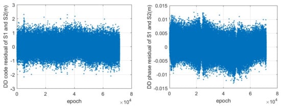 As an example, the series of double-differenced residuals between the two CAPS satellites S1 and S2 are shown in Figure 6. The standard deviation (STD) of the residual from all pairs of CAPS satellites are illustrated in Table 1. The STD of the residuals of the double-differenced code measurements ranges from 0.42 to 0.57 m, while the STD of the residuals of the double-differenced carrier-phase measurements varies between 0.13 and 0.34 cm. Providing that the STDs of the un-differenced measurements are identical for different CAPS satellites and that they are independent from each other, we can infer that the noise of the code measurements is about 0.25 m, and that the noise of the carrier-phase measurement ranges from 0.07 to 0.17 cm. The high accuracy of the carrier-phase measurement is advantageous for further improving the CAPS precise positioning.