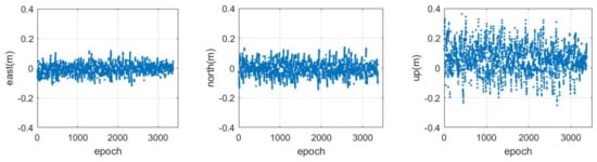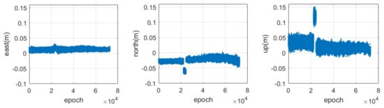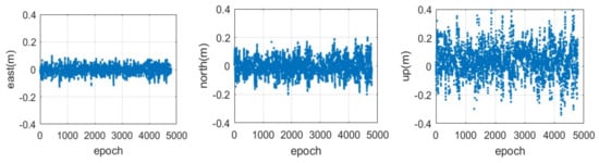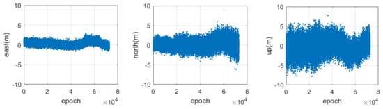 Moreover, the carrier-phase observation can be considered as the high precise range measurement when the integer ambiguity can be reliably resolved. The number of CAPS satellites was no more than 5 when we carried out our experiment, and the geometric distribution was not very good due to the 4 GEO satellites being located in east-west directions. Additionally, the receiver can only obtain the observation of a single frequency. These make it quite difficult to fix the ambiguities reliably and quickly based on the geometry-based algorithm in current GNSSs like LAMBDA [] since this relies on the geometrical change caused by the satellites’ movement [,], while the GEO satellites are almost stationary relative to users in CAPS. In this study, the ambiguities were directly estimated using the geometry-free method via Equations (8) and (9).